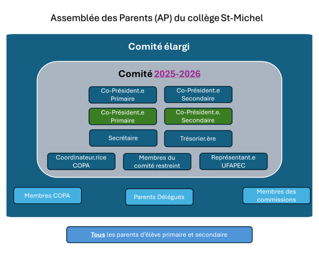 Tous les parents ayant un ou plusieurs enfants inscrits au Collège Saint-Michel (sections primaire et secondaire) sont membres de plein droit de l’Association des Parents d’Élèves du Collège Saint-Michel.